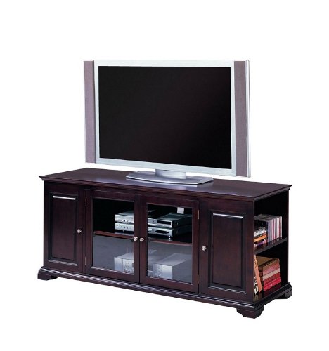 This Handsome Espresso Console is a Great Way to Showcase Your Home Theater holding most TV's up to 62 inches, weighing 240 pounds or less. Adjustable shelf holds audio/visual equipment with additional storage behind lower cabinets. Two open side cabinets hold 20 VHS tapes, 48 CDs or 38 DVDs.